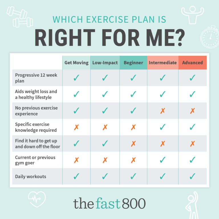 Progression is vital to improve both strength and stamina and this is the reason we offer multiple levels of exercise difficulty on The Fast 800 exercise plan. The aim of our exercise programme is to gradually move members through the levels, while helping them become fitter and stronger.