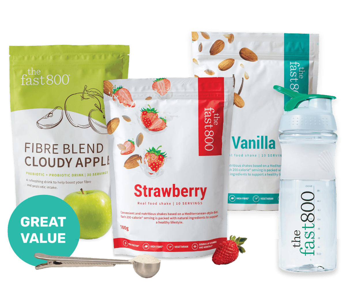 The Fast 800 Shakes contain more than 20g of protein per serving, while the Cloudy Apple Fibre Blend contains almost 6g of fibre per serving – about 20% of your daily fibre needs.